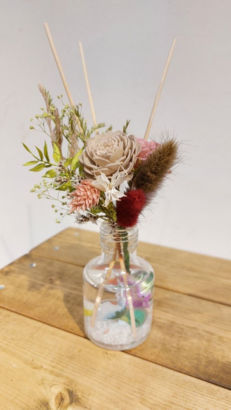 ドライフラワーと精油を使ったリードディフューザーを作ります。
