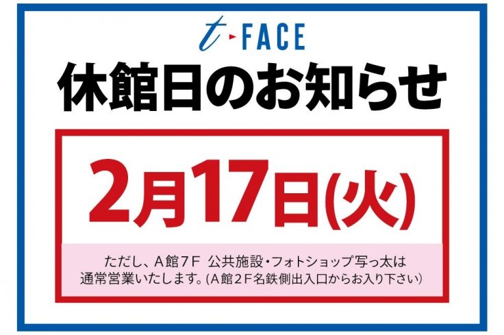2/17(火)は年に一度の法定点検日のため、休館させていただきます。