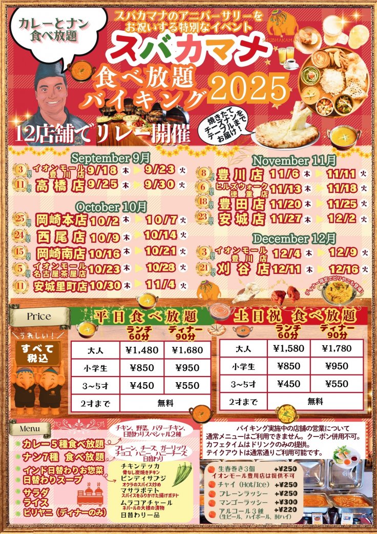 カレーは日替わり2種類含め5種類、ナンは日替わり1種類含め7種類ご用意します。ランチ60分、ディナー90分です。