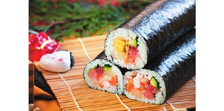 三代目ふらり寿司&お台所ふらりより、 今年も恵方巻を販売いたします!! 海鮮七福恵方巻き(ハーフ) ¥950 サーモン・知多湾産白身魚など全11種入り 【ご予約受付】 1/16(金)~2/1(日) 【お受渡し期間】 2/3(火) ※価格は総額表記です。 ※写真はイメージです。 ※代金は事前支払いとなります。