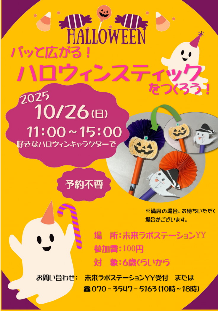 パッと広がるスティックを作ります。好きなハロウィンキャラクターが1つ選べます。 時間:11:00〜15:00 対象:5歳くらいから 参加費:100円 場所:A館6階未来ラボステーションYY 予約不要 ※満席の場合はお待ちいただく事がございます。 問い合わせ:未来ラボステーションYY お電話 070-3547-5163(10:00〜18:00)