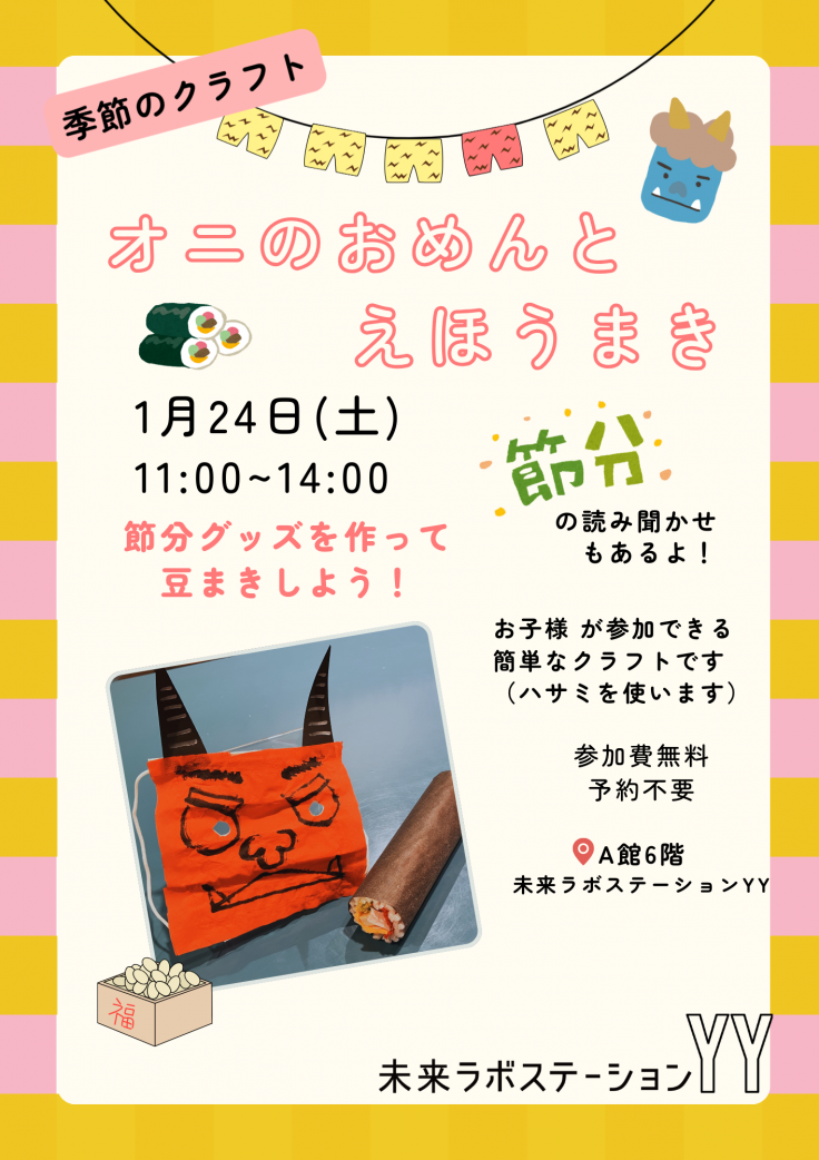 節分に向けて 『鬼にお面と恵方巻き』を作りましょう! 身近な材料で簡単に作れますよ! 対象:お子様(5歳くらい〜)と保護者 参加費:無料 時間:11:00 〜 14:00 会場:A館6F 未来ラボステーションYY