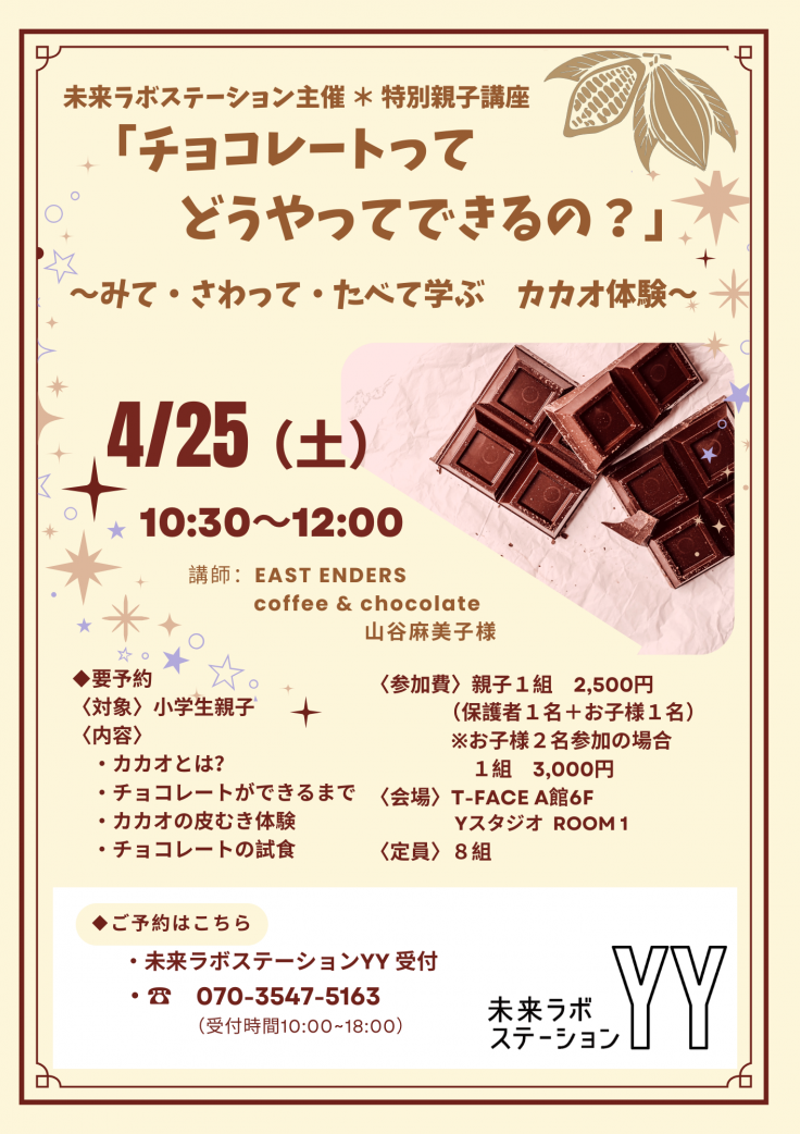 見て・触って・味わう体験を通して、チョコレートができるまでの工程を親子で楽しく学ぶワークショップです。