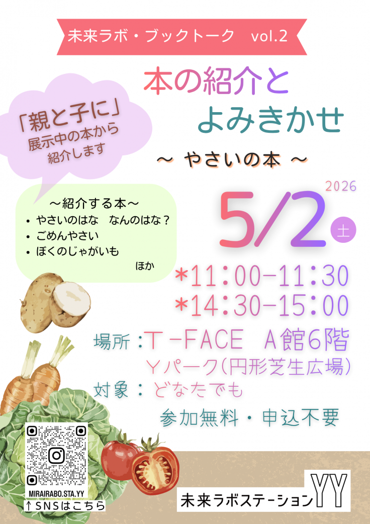 未来ラボ内 テーマ別の展示コーナー 『親と子に』にて現在展示中の「野菜の本」から厳選して 本の内容と読み聞かせを行います。 スタッフの楽器演奏もあります。 時間:① 11:00〜11:30、②14:30〜15:00 場所:T-FACE A館6F Yパーク(円形芝生広場) 対象:どなたでも 参加費無料、申込不要
