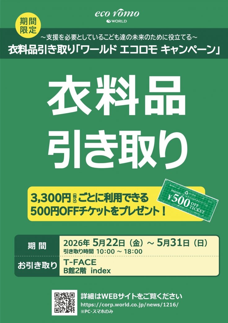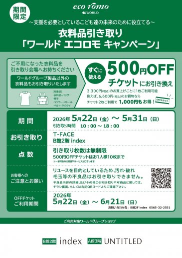 店頭で不要な衣料品を回収します。 1点につき500円OFFチケット(3300円ごとに利用可能)の配布。 チケットの配布はお一人様10枚まで。 ※衣料品回収は5/22~5/31 ※OFFチケット利用は5/22~6/21