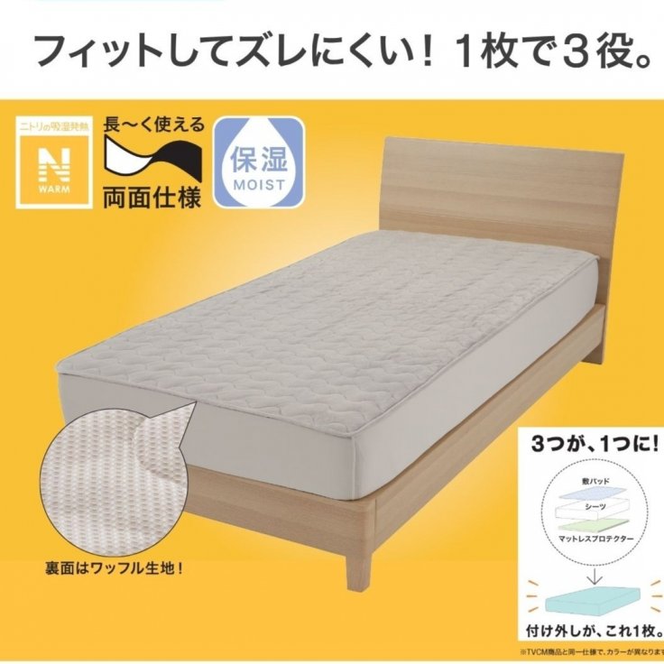 敷きパッド、シーツ、プロテクターの3つが1つに!1枚3役でタイパもコスパもgood! 表面はあたたかいNウォーム、裏面はワッフル面の両面仕様だからこれからの時期に大活躍!