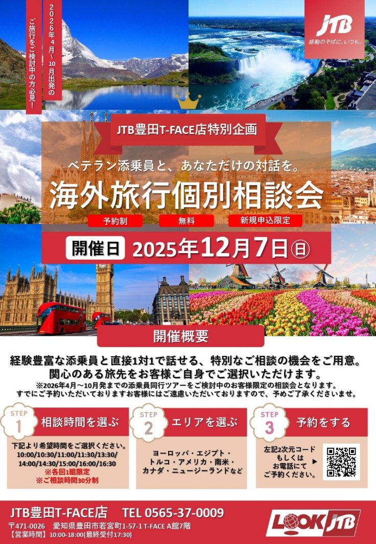 経験豊富な添乗員と直接 1 対 1 で話せる、特別なご相談の機会をご用意。 関心のある旅先をお客様ご自身でご選択いただけます。 2026 年 4 月~ 10 月発までの添乗員同行 ツアーを ご検討中のお客様限定の相談会となります。 すでにご予約いただいておりますお客様にはご遠慮いただいております ので、予めご了承 くださいませ。