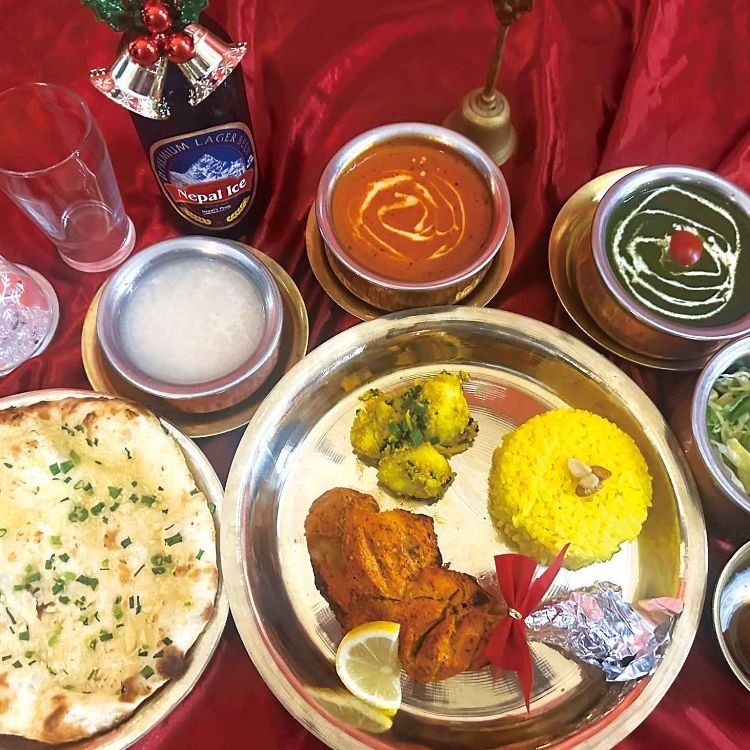 炭焼きタンドリチキン、お好きなナンとカレー2種、インドの伝統デザート、グラブジャムとアルコール(ノンアルコール有)がついたインド料理フルコース