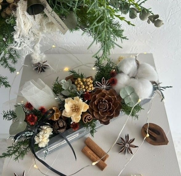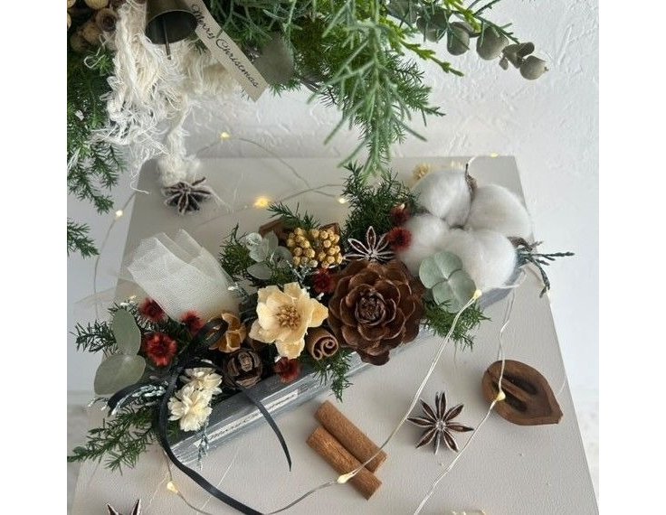 W20XD5XH4cm の木箱に、ドライフラワーやコットンフラワー、プリザーブドフラワーを使ったボックス型のクリスマスアレンジメントです。